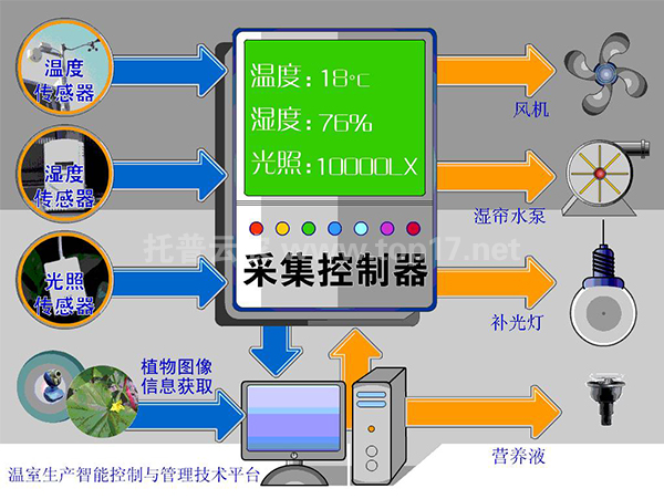 對于大規模的溫室化種植而言,單靠人工管理需要大量人手,耗力費時,并且存在難以避免的人工誤差。物聯網系統采集溫室內的空氣溫濕度、土壤水分、土壤溫度、二氧化碳、光照強度等實時環境數據,通過中繼節點傳輸到控制中心,由中心平臺系統將最新監測數據與預先設定適合農作物生長的環境參數進行比較,比如發現傳感器檢測到的數據與預設數值有了偏差,計算機會自動發出指令,只能啟動系統相連接的通風機、遮陽、加濕、澆灌等設備的工作,直到大棚內環境數據達到系統預設的數據范圍之內,相關設備才會停止工作。