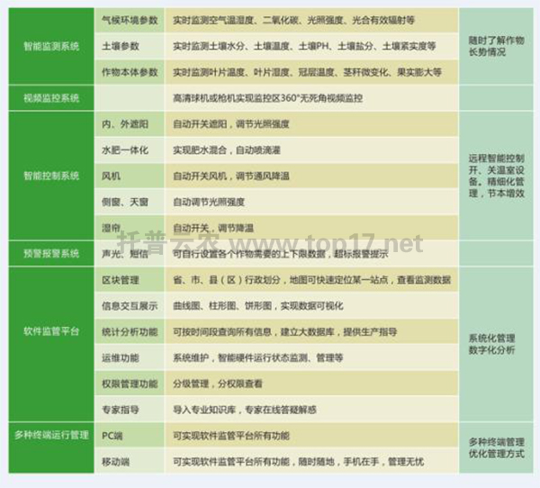 智能農業溫室大棚,可實時無線采集和傳輸溫室大棚內的溫度、濕度、光照、土壤溫濕度、CO2濃度、葉面濕度、露點溫度等環境參數,通過PC電腦、移動手機和平板電腦以直觀的圖表和曲線的方式顯示給用戶,并根據種植作物的需求提供各種聲光報警信息。它主要由農業溫室大棚、智慧農業溫室大棚信息展示屏、各種無線傳感器、控制器及系統軟件等組成。
