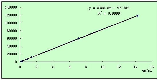 配置濃度分別為0.142、0.284、0.853、1.422、7.110、14.220μg/mL的三聚氰胺標準工作液。將以上6種標準工作液在上述色譜條件下按濃度由低至高進樣。用最小二乘法以對照品濃度(橫坐標X軸,µg/ ml)對峰面積(縱坐標Y軸)進行線性回歸,求算標準曲線。