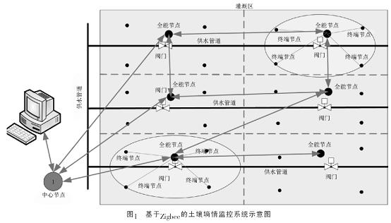 一般情況下, 根據灌溉工具在灌溉區的實際灌溉能力, 可將灌溉區劃分為若干個小灌溉塊,這些小灌溉塊通常可由1個全能節點和若干個終端節點組成一個小型的星型網絡, 然后由全能節點控制小灌溉塊的供水閥門, 并由終端節點負責采集該灌溉塊各個區域的土壤墑情。各個小灌溉塊之間的全能節點、終端節點與中心互連, 以構成一個WSN網絡, 網絡中只起路由功能的全能節點, 可以保證網絡通信的可靠性。網絡組建成功后, 終端節點將定時采集土壤濕度數據, 并將數據直接上傳給中心節點, 同時也可以利用WSN網絡的多跳功能將數據傳輸給上級的全能節點, 然后通過若干個全能節點地接力, 將數據傳送給中心節點。中心節點對信號進行分析后, 再將分析結果發送給該小灌溉塊的全能節點, 并通過全能節點來控制閥門以調節灌溉用水的用量。基于Zigbee的土壤墑情監控系統示意圖如圖1所示。