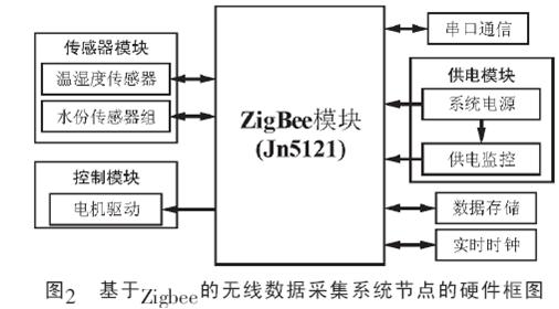 操作, 并可組建一個具有自組織、多跳動態路由機制的無線傳感器網絡。傳感器模塊主要負責連接各類傳感器, 包括水分傳感器, 溫濕度傳感器。電機驅動模塊主要用于驅動外部的灌溉閥門的電機。通過電機驅動系統和JN5121模塊, 便可以實時控制灌溉閥門的開關。