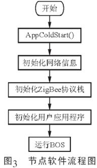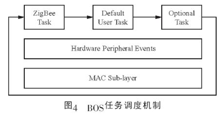BOS 系統可控制執行Zigbee Task 和DefaultUser Task, 其中Zigbee Task可作為單獨任務被執行, APS (Application Sub-layer) 和ZDO (ZigbeeDevice Objects) 都在Zigbee Task中執行。DefaultUser Task則在BOS系統初始化時被創建。BOS系統初始化時, 最多可以定義兩個User Task, 根據功能實現的需要, 可以在Default User Task中定義應用程序。Hardware Peripheral Event 和MACSub-Layer等屬于隨即事件, 可以中斷的形式在Optional Task中處理。