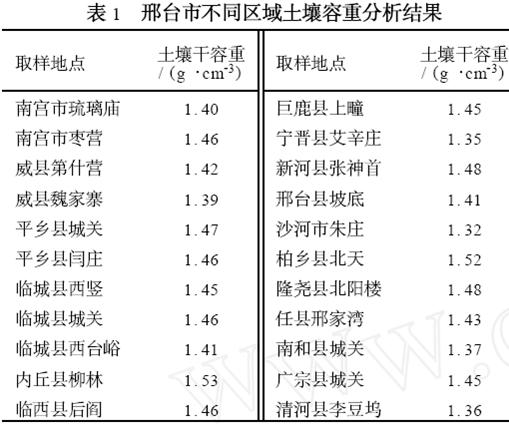 土壤容重除用來計算土壤總孔隙度外,還可用于估計土壤的松緊和結構狀況。表1 為邢臺市不同區域的土壤容重測驗結果。