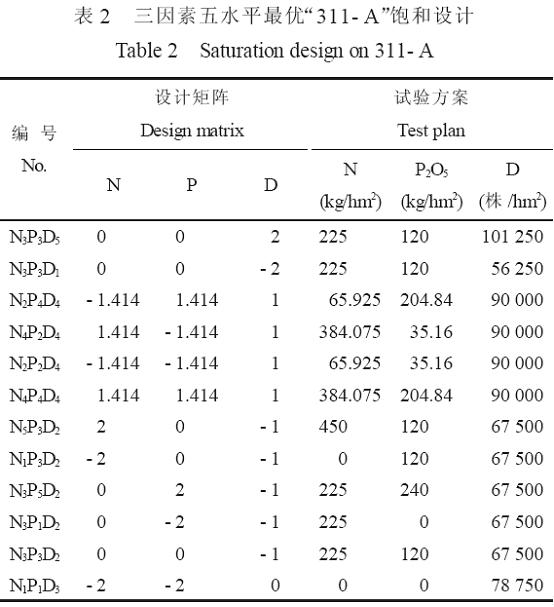 供試品種為青貯玉米品種金坤9 號。試驗設計為施氮量(純N)、施磷量(P2O5)、種植密度(D)3 個因素、5 個水平, 采用311- A 飽和設計, 12 個處理組合(表1, 表2), 重復3 次, 共36 個試驗小區, 每小區面積為15 m2, 行距50 cm。播種期為4 月28 日, 播種前施有機肥22 500 kg/hm2, 磷肥按處理水平作為底肥隨播種一次性施入, 尿素分別在小喇叭口期和大喇叭口期按施肥總量的30%和70%追施, 生育期間結合追肥灌水3 次, 其它管理措施同普通玉米大田。