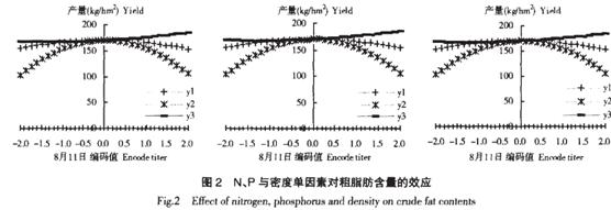 由一次項和二次項的偏回歸系數和t 值(表7、表8)可知, N、P、種植密度單因子與粗脂肪產量的關系, 在8 月11 日和9 月12 日收獲為密度(X3)>P(X2)>N(X1); 8 月26 日收獲為P(X2)>N(X1)> 密度(X3)。兩因子交互效應, 在8 月11 日和8 月26 日收獲為NP>N 密度>P 密度; 9 月12 日收獲為N 密度>NP>P 密度。
