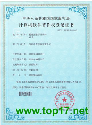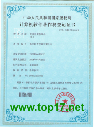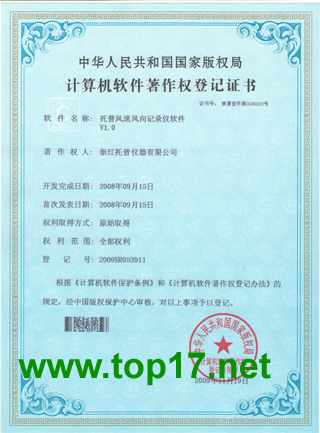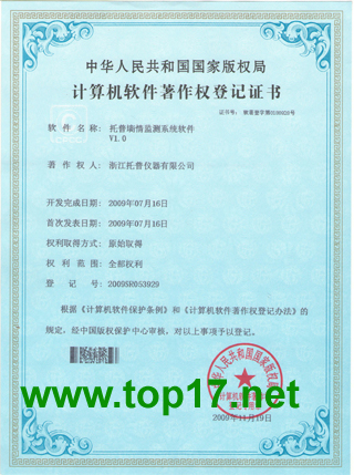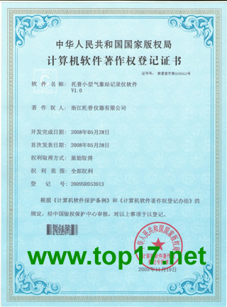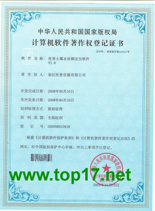 2009年,浙江托普儀器有限公司共獲得11項計算機軟件著作權,并取得了由國家版權局頒發的相關計算機軟件著作權證書,除面積測量儀、土壤水分有機質測量儀和農業環境監測系統外,另外8項軟件產品名稱分別為:定氮儀軟件V1.0,二氧化碳記錄儀軟件V1.0,風向風速記錄儀軟件V1.0,光量子計軟件V1.0,墑情監測系統軟件V1.0,土壤水份測定儀軟件V1.0,溫濕光記錄儀軟件V1.0,小型氣象站記錄儀軟件V1.0八項軟件證書。