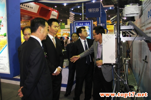 圖為:業(yè)界領(lǐng)導(dǎo)在托普展位了解固定式無(wú)線土壤墑情檢測(cè)系統(tǒng)