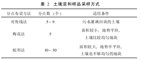 在土壤環(huán)境質(zhì)量監(jiān)測(cè)工作中,一般采集混和土樣,即在一個(gè)采樣區(qū),把多點(diǎn)采集的土樣混合成一個(gè)樣品,一方面可以減少分析量,另一方面可以把采樣區(qū)微量不均勻性的影響減到最低限度。采樣時(shí)應(yīng)沿著一定的路線,按照/隨機(jī)0、/等量0和/多點(diǎn)混合0的原則進(jìn)行。在該次土壤調(diào)查中常用的多個(gè)采樣點(diǎn)的布設(shè)方法是:對(duì)角線采樣法、蛇形采樣法和梅花形采樣法等,其適用條件和采樣的分點(diǎn)數(shù)見(jiàn)表2。