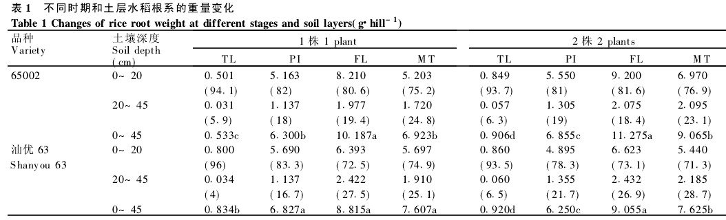 根系重量以開花期為最大,從分蘗期到開花期根系重量為增長階段,開花后為下降階段.1998年根系生長動(dòng)態(tài)與1999年趨勢相同,現(xiàn)以1999年資料為例說明.開花期總根量除汕優(yōu)63單本種植外其它處理均顯著高于其它時(shí)期,分蘗期根量顯著低于其它時(shí)期(表1).65002從分蘗期到穗分化期和穗分化期到開花期根系重量平均增長519和411g,開花期到成熟期根量平均下降218g.汕優(yōu)63從分蘗期到穗分化期和穗分化期到開花期根系重量平均增長517和214g,開花期到成熟期根量平均下降114g(表1).由此可見,水稻根系重量的主要增長期在分蘗期到穗分化期.花后根系重量下降主要發(fā)生在0~20cm耕層中,65002和汕優(yōu)63分別下降2162g和0194g,而土層20~45cm的深層根系重量下降相對較小(表1).每筒種植2株比1株各生育期根量均增加.
