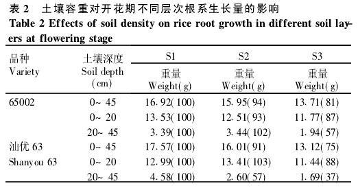土壤容重對深層根(20~45cm)生長的影響大于表層根(0~20cm).以土壤容重112g#cm-3為100%,當(dāng)土壤容重為114g#cm-3時(shí),65002和汕優(yōu)63表層根分別為93%和103%,深層根分別為102%和57%.當(dāng)土壤容重為116g#cm-3時(shí),65002和汕優(yōu)63表層根分別為87%和88%,而深層根分為57%和37%.因此,當(dāng)土壤容重提高時(shí),深層根系重量下降更大,深層根系重量占根系總量比例下降.