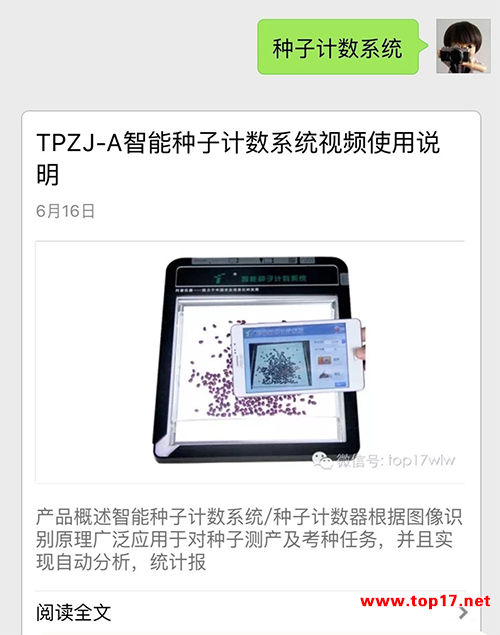 現在只需關注“浙江托普云農科技股份有限公司”的微信公眾號,回復對應的關鍵字,即可查看儀器操作視頻,比如需要查看智能種子技術系統的操作視頻,只需要回復“種子計數系統”或者儀器型號即可了解如何使用儀器,查看儀器的相關參數和功能。