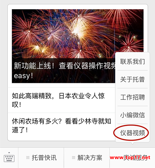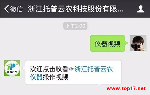 在“浙江托普云農科技股份有限公司”微信號的菜單欄也提供了查看視頻的入口,只需要選擇“真誠服務”→“儀器視頻”即可進入頁面查看。