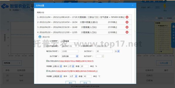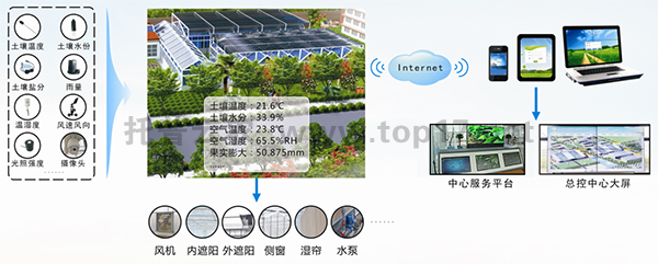 對于規模化的溫室大棚種植而言,單靠人工管理需要大量人手,耗力費時,并且存在難以避免的人工誤差。托普設施農業智能監控系統可采集溫室內的空氣溫濕度、土壤水分、土壤溫度、二氧化碳、光照強度等實時環境數據,傳輸到控制中心,由中心平臺系統將最新監測數據與預先設定適合農作物生長的環境參數與進行比較,如發現傳感器監測到的數據與預設數值有了偏差,計算機會自動發出指令,智能啟動與系統相連接的通風機、遮陽、加濕、澆灌等設備進行工作,直到大棚內環境數據達到系統預設的數據范圍之內,相關設備才會停止工作。