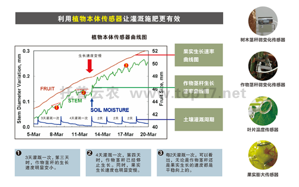 植物本體傳感器,能實時或階段性地監測植物莖稈粗細的變化、葉面的溫度、莖流速率、果實增重與膨大速率、植物的光合作用等植物本身的一些參數,能直觀地反應植物的生長狀態。通過對作物參數的測量可直觀反映土壤或空氣環境參數對作物的影響,從而指導用戶更加科學合理地調控生產環境,以達到作物高產優質。